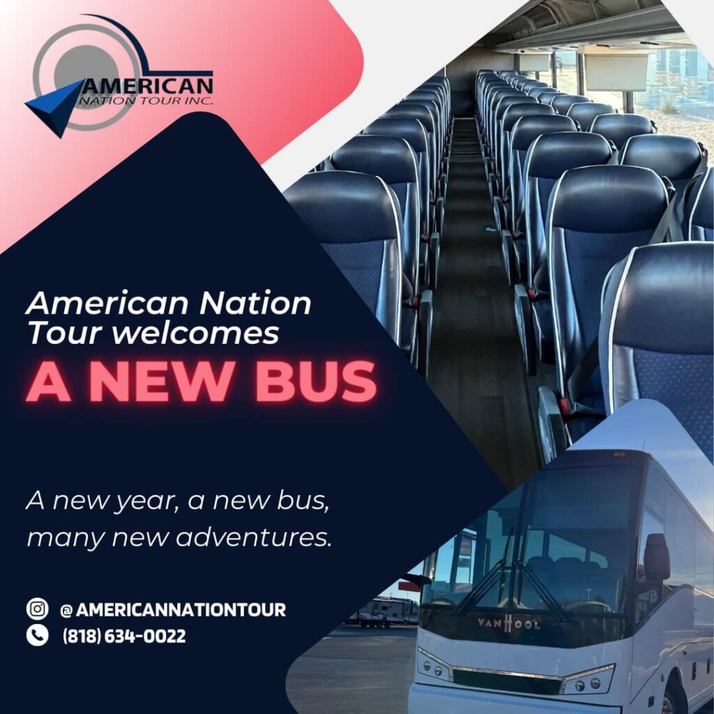 As we approach the New Year, American Nation Tour welcomes a new addition to our bus fleet. With 56 reclining seats, Bluetooth, and an in-cabin restroom, this bus is fully equipped to provide the most comfortable transportation you can imagine. Give us a call today to book! (818) 634-0022